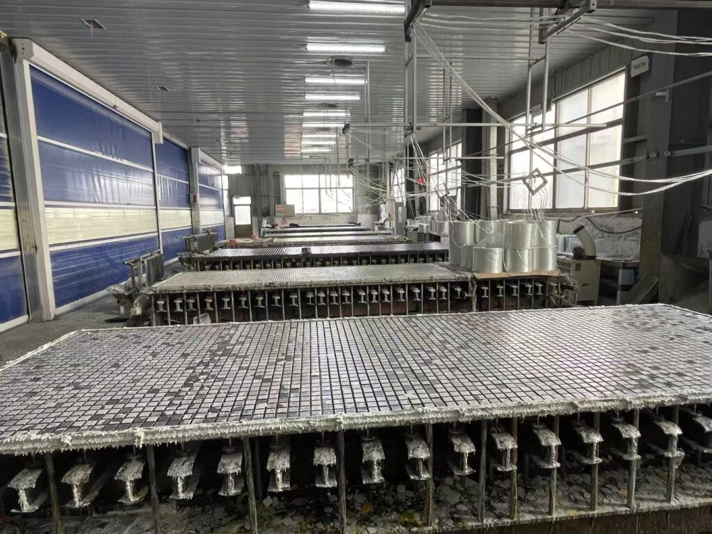 FRP Molded Grating is produced using vertical and horizontal continuous fiberglass that are thoroughly soaked in unsaturated polyester resin. This manufacturing process provides superior bi-directional mechanical properties, ensuring high strength and durability. The mixed materials are placed into an open, heated mold, where the resin and fiberglass cure together to form an integral, grid-like structure.